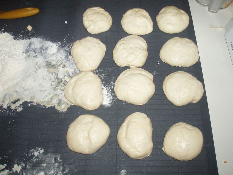 Preheat oven to maximum (in our case 250 degrees C). Also put the baking tray (lined with baking sheet) just above the bottom of the oven, so it gets preheated too. Cut the rope in quarters, and each quarter into 3. Shape the little bits into rounds and allow them to sit, preferably covered, while the oven heats.